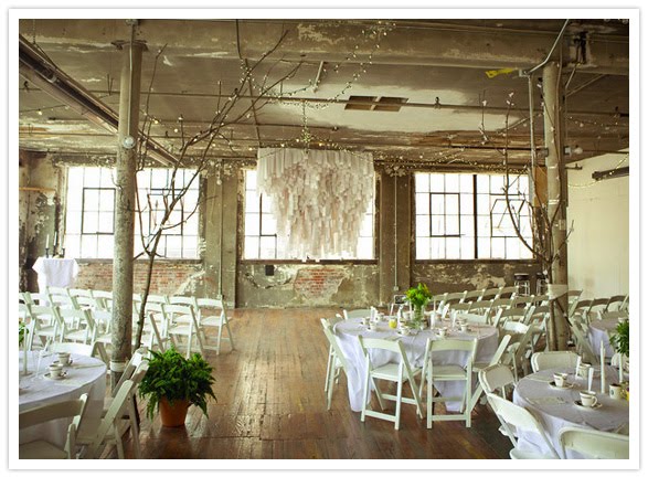 Amazing space and hanging paper backdrop. Simple white tables help the venue really show itself off. Original and the details are so well thought out. Via 100 Layer Cake. Check out the rest of the photos!